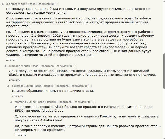 Slack больше не будет напрямую предоставлять свои услуги в Китае. Клиентам предлагают перейти на партнерскую подписку от Alibaba до 1 февраля 2026 года.