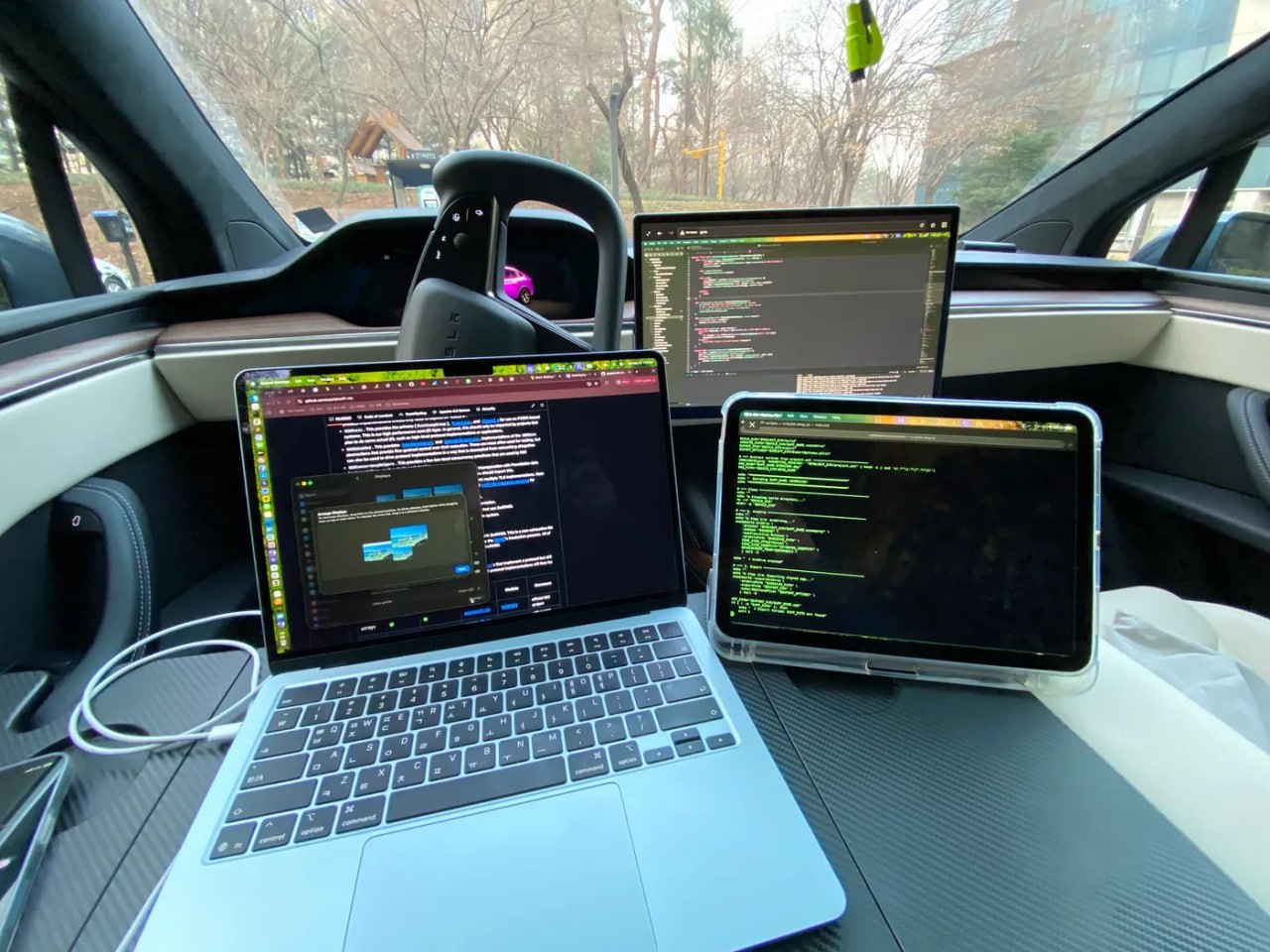 Человек организовал себе мини-офис в Тесле и сделал дисплей автомобиля дополнительным монитором через WebRTC без проводов, лишних доступов и модификации оборудования.