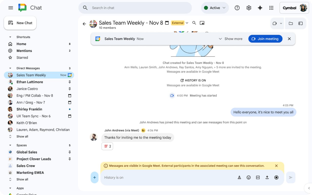 Внешние гости будут иметь доступ к чату только на время своего участия. Переписку до присоединения и историю после они не увидят. Если на встрече присутствует гость извне, внутренние участники увидят явное предупреждение в шапке + прямо над строкой ввода сообщения.