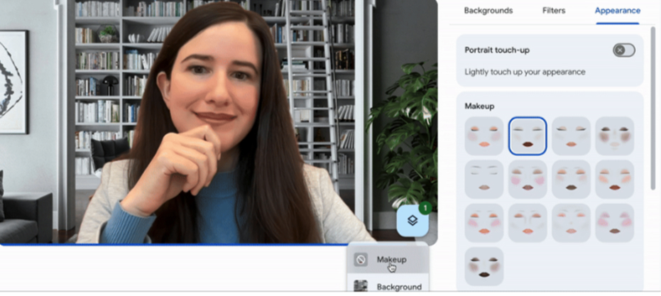 Google тоже добавил ИИ-макияж в Meet. Можно выбрать из 12 готовых образов «от безупречного профессионального до более выразительного». Смотреть прямо в кадр необязательно, можно шевелиться, отхлёбывать из чашки и потирать лоб — макияж подстроится.