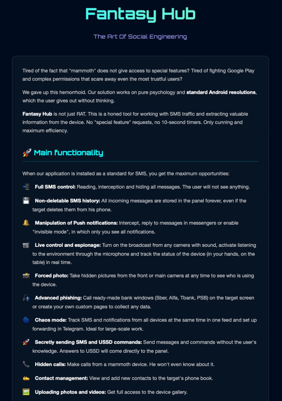 Fantasy Hub получает полный контроль над устройством через роль SMS-обработчика. Дает доступ к камере, файлам и контактам без дополнительных разрешений. Может вести аудио- и видеотрансляции в реальном времени с зараженного телефона через WebRTC.