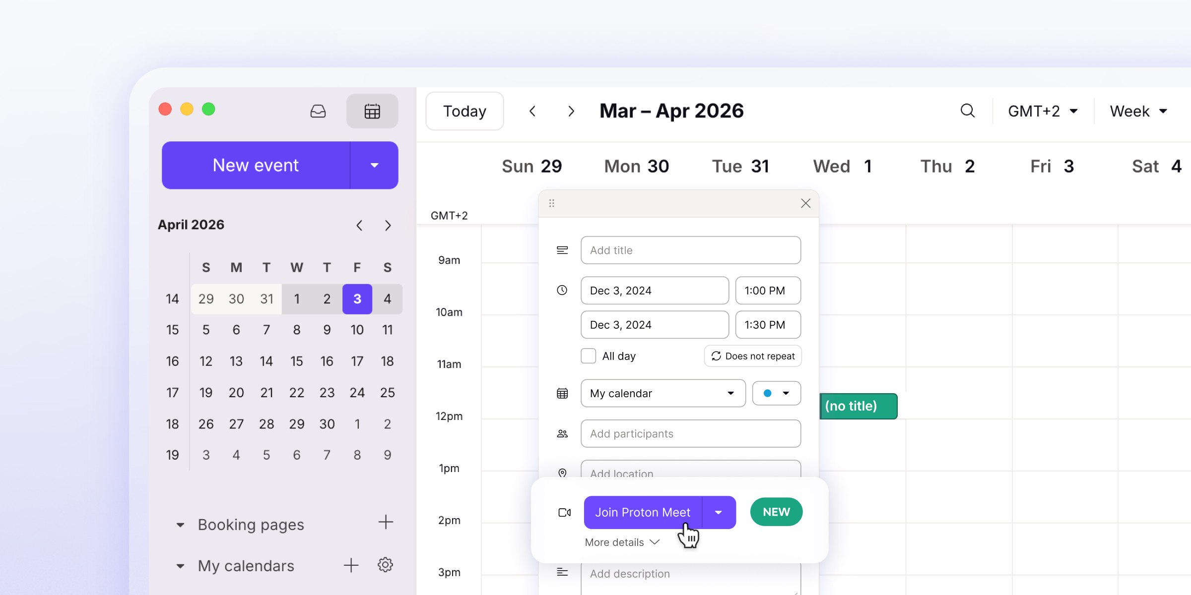 Запланированные встречи можно добавлять в календарь Proton, Google или Microsoft, приглашать коллег и друзей забронировать время в вашем календаре.